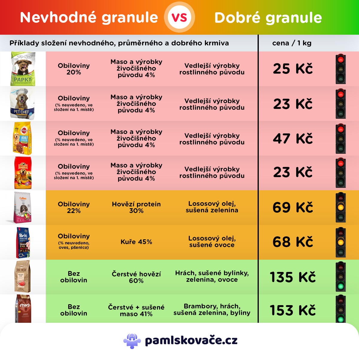 Vybrali jsme pro vás 10 výživově nejhorších granulí pro psy, které jsou dostupné na českém trhu, přičemž jejich cena je natolik atraktivní, že většinu z nich zakoupíte za méně než 500 Kč/10 kg balení. Pro nás je však prioritou obsahová složka a ačkoliv každé z následujících nejlevnějších granulí pro psy obsahují také vitamíny, minerály nebo třeba omega-3 mastné kyseliny, maso v nich budete hledat doslova s lupou či mikroskopem.