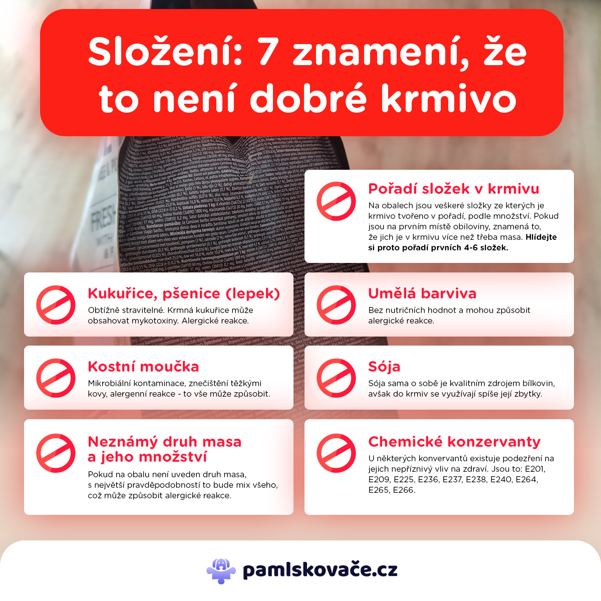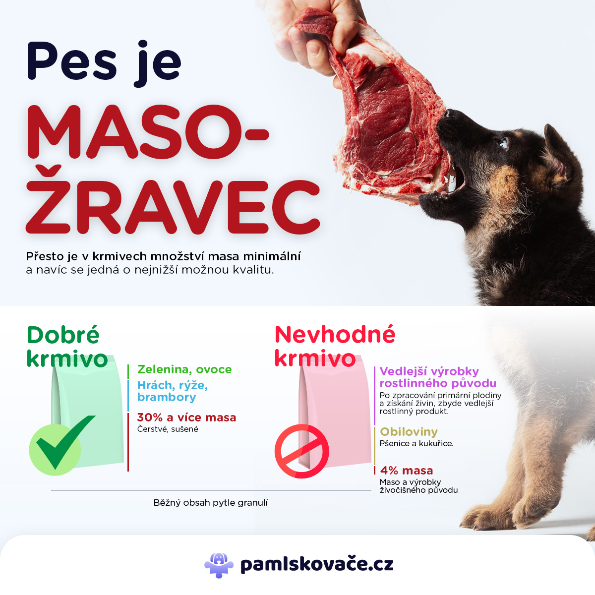 V nejlevnějších granulích pro psy často naleznete vedlejší výrobky živočišného původu, což jsou odpadní části zvířat nebo celá těla zvířat, která jsou naprosto nevhodná k lidské spotřebě (uhynulá zvířata, kůže, kosti, odřezky masa při zpracování a výrobě potravin, krev, střeva aj.). Dali byste tedy svému psovi zkonzumovat něco, co by pro vás samotné bylo natolik škodlivé, že by vám mohlo ublížit?